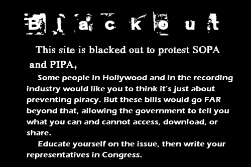 Black Out Don’t Censor the Net Share this: Click to share on Facebook (Opens in new window) Facebook Click to share on X (Opens in new window) X Click to share on Tumblr (Opens in new window) Tumblr More Click to share on Reddit (Opens in new window) Reddit Click to share on Pinterest (Opens in new window) Pinterest Click to share on LinkedIn (Opens in new window) LinkedIn Click to email a link to a friend (Opens in new window) Email Like Loading... Related